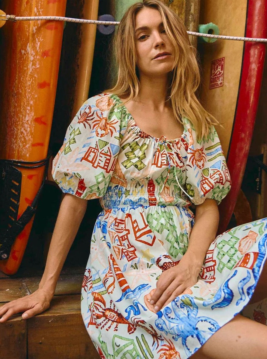 The Drew dress was designed to embrace the spirit of spring with effortless style and flirtatious charm. Featuring a scoop neckline with drawstring tie detail. a smocked elastic waist and a shirred mini skirt. we predict Drew will be a star this season.