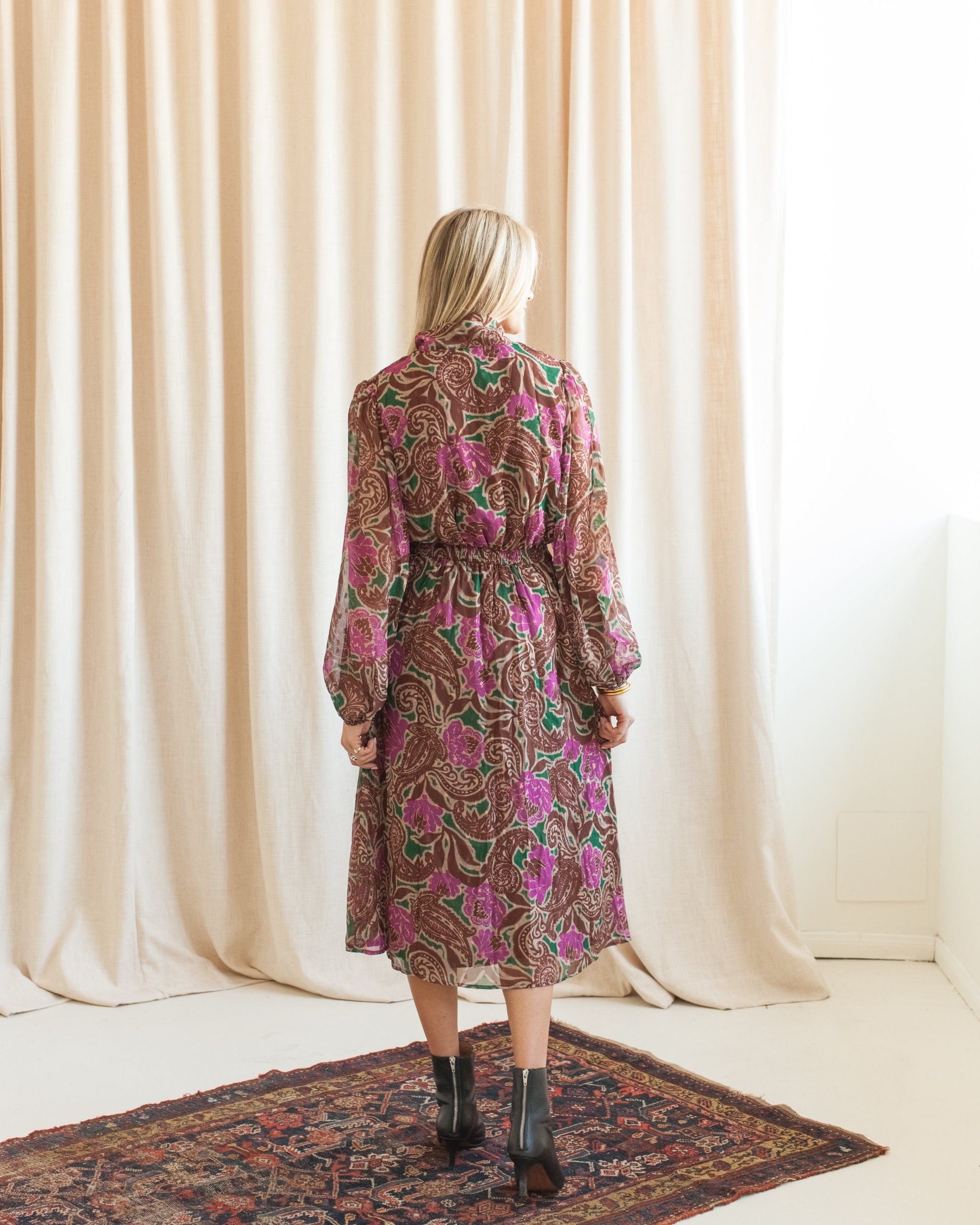 A midi dress featuring front bow tie closure. balloon sleeves with elasticated cuffs. and smocked back waist band for additional comfort. Pair with your favorite suede boots and a clutch.