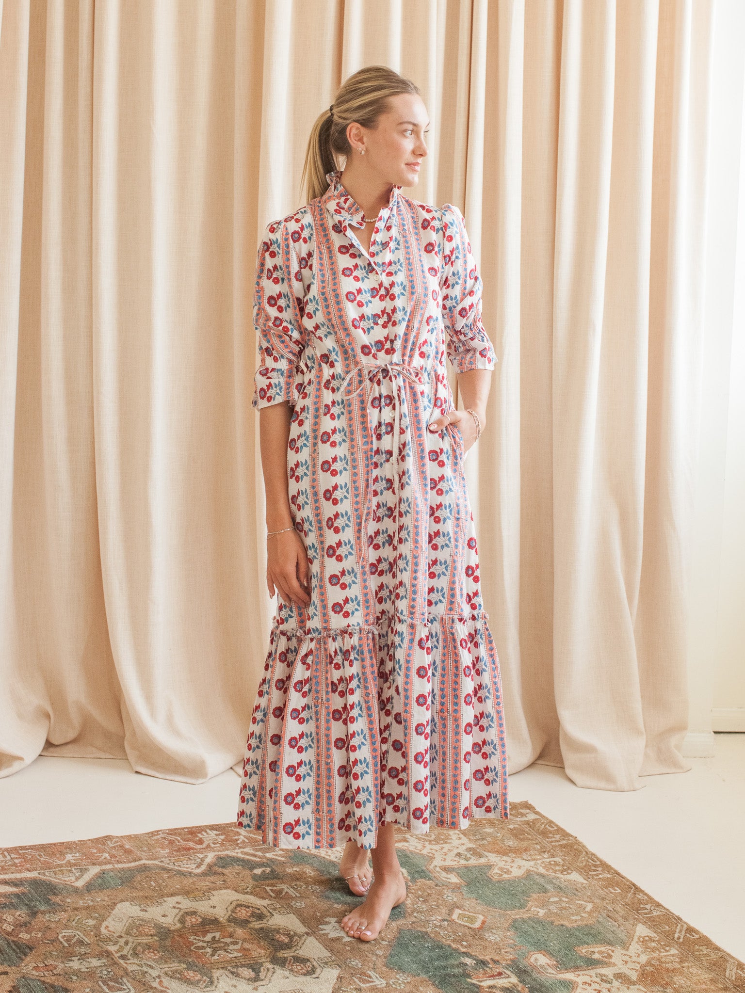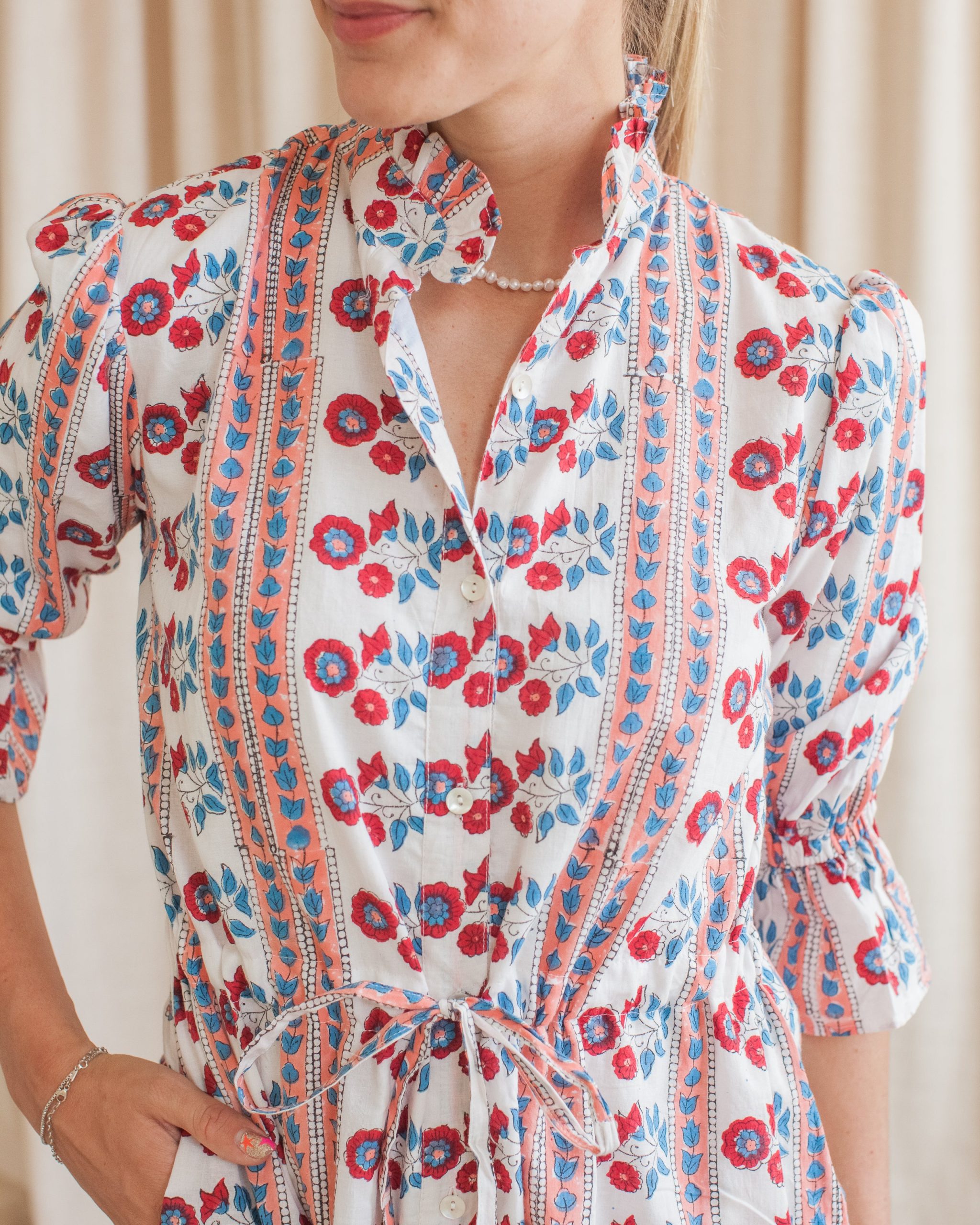 Made by us. for you. A feminine shirt dress with a ruffle Victorian collar. 3/4 sleeve. button front. fully lined. and pockets. complete with a drawstring waist. Made by the same female owned workshop that creates our table top collection. each dress is crafted by hand made with hand block printed fabrics.