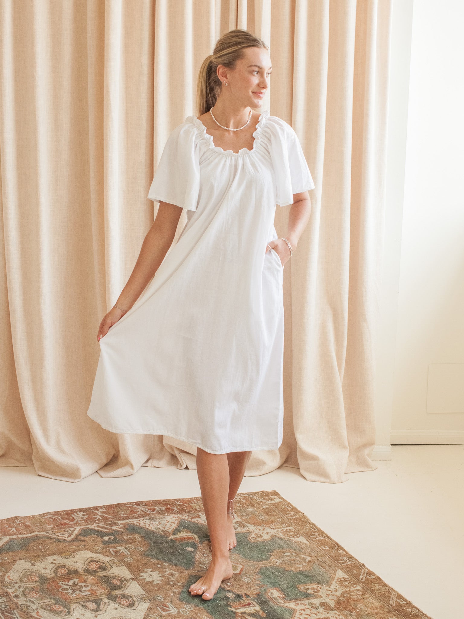 A beautiful short sleeve midi length house dress that is fully lined with eyelet lace details at the hem and cuffs. Dress can be worn on or off the shoulder and is complete with pockets.