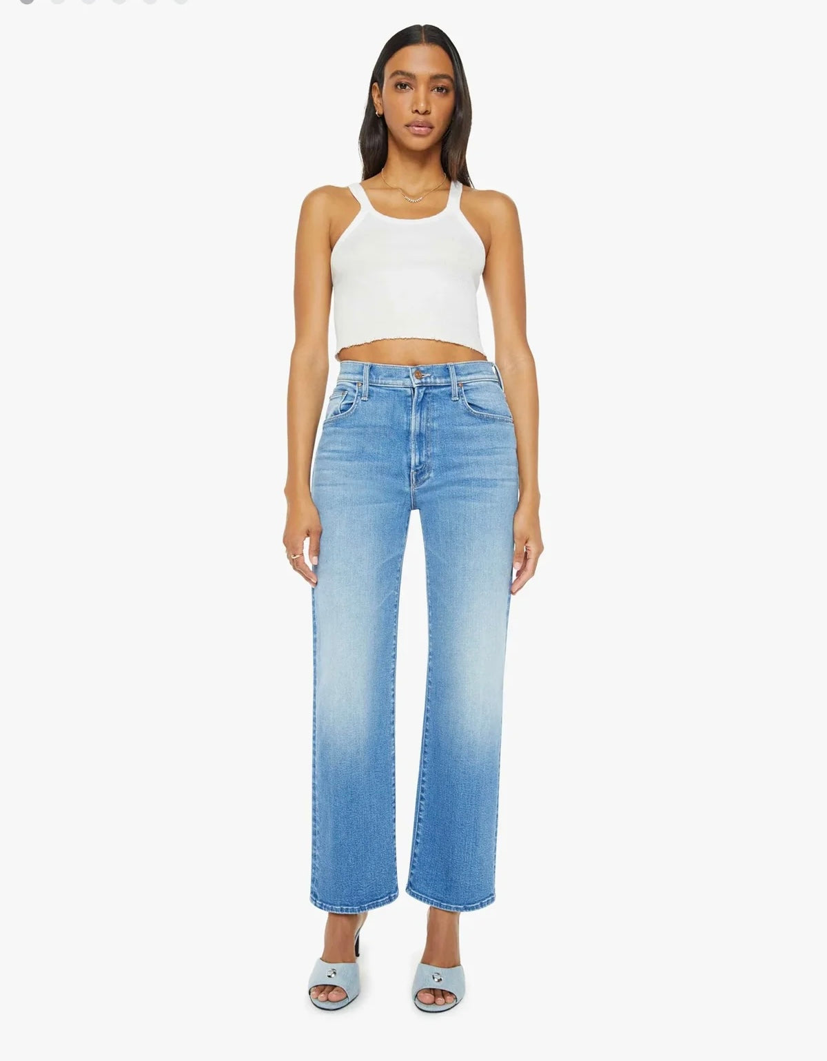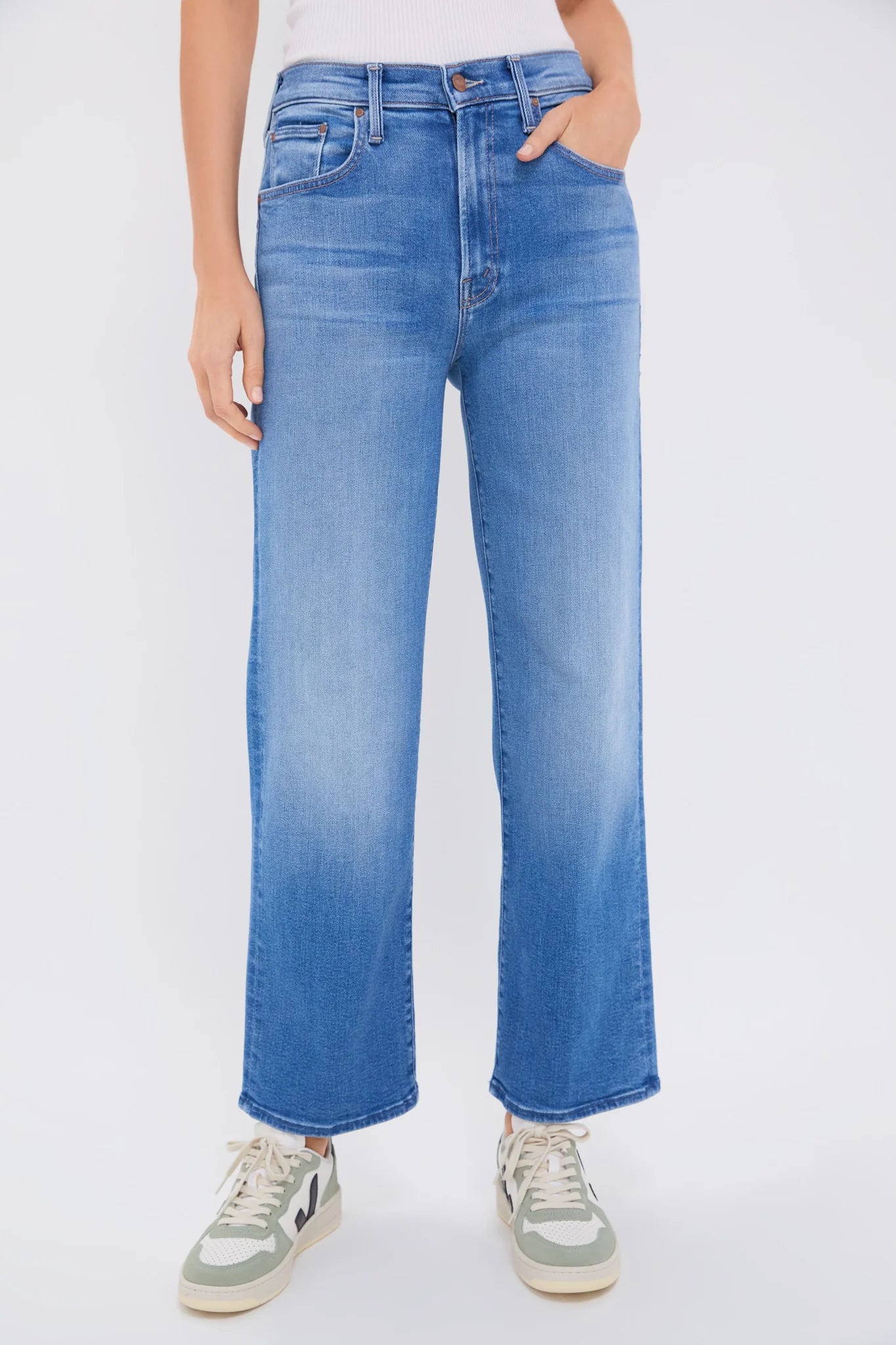 Take a hint. High-waisted jeans with a wide straight leg. zip fly and clean 29.25-inch inseam. Crafted from soft stretch denim. Read Between The Lines is a medium blue wash with subtle fading and whiskering.