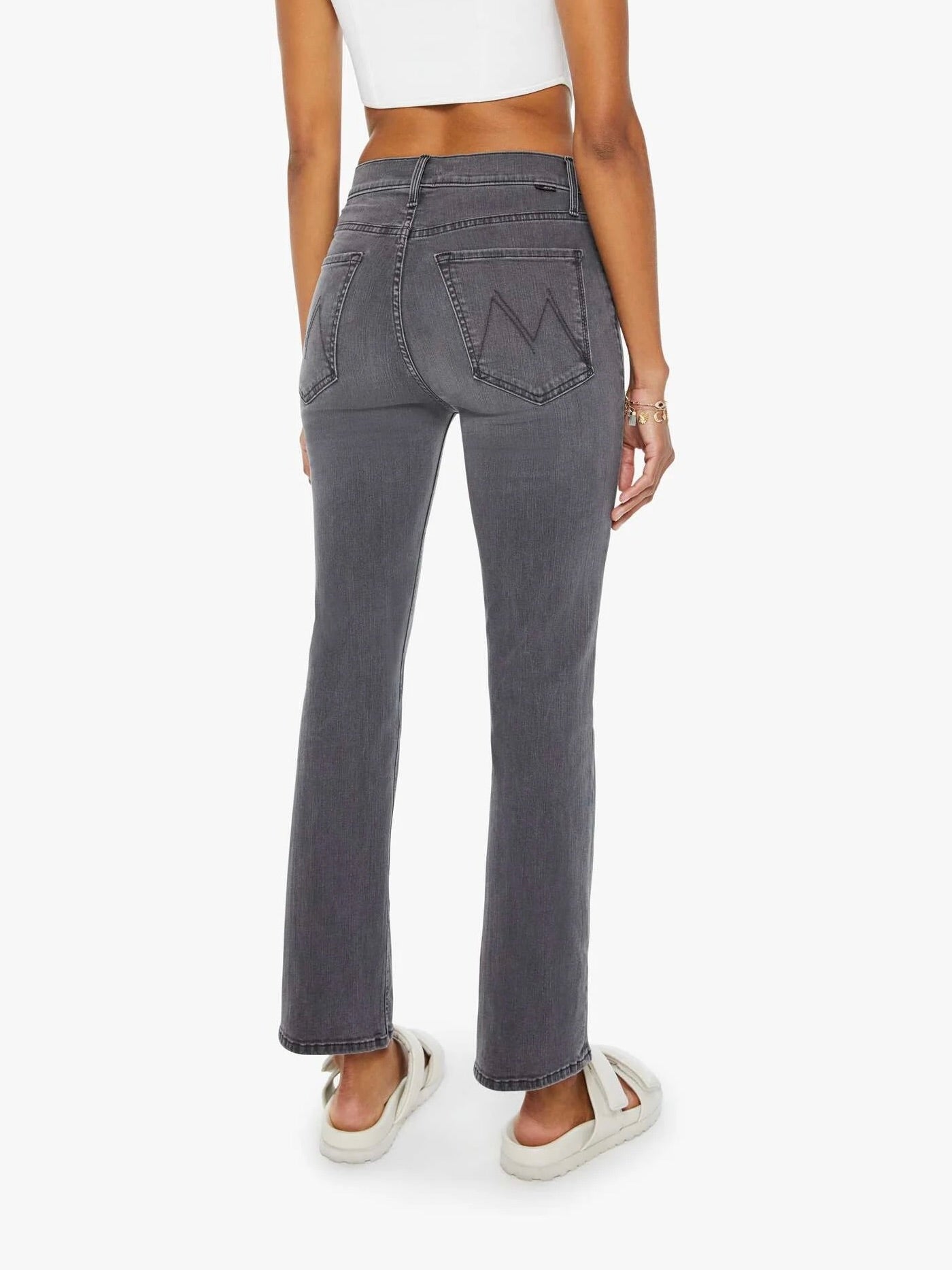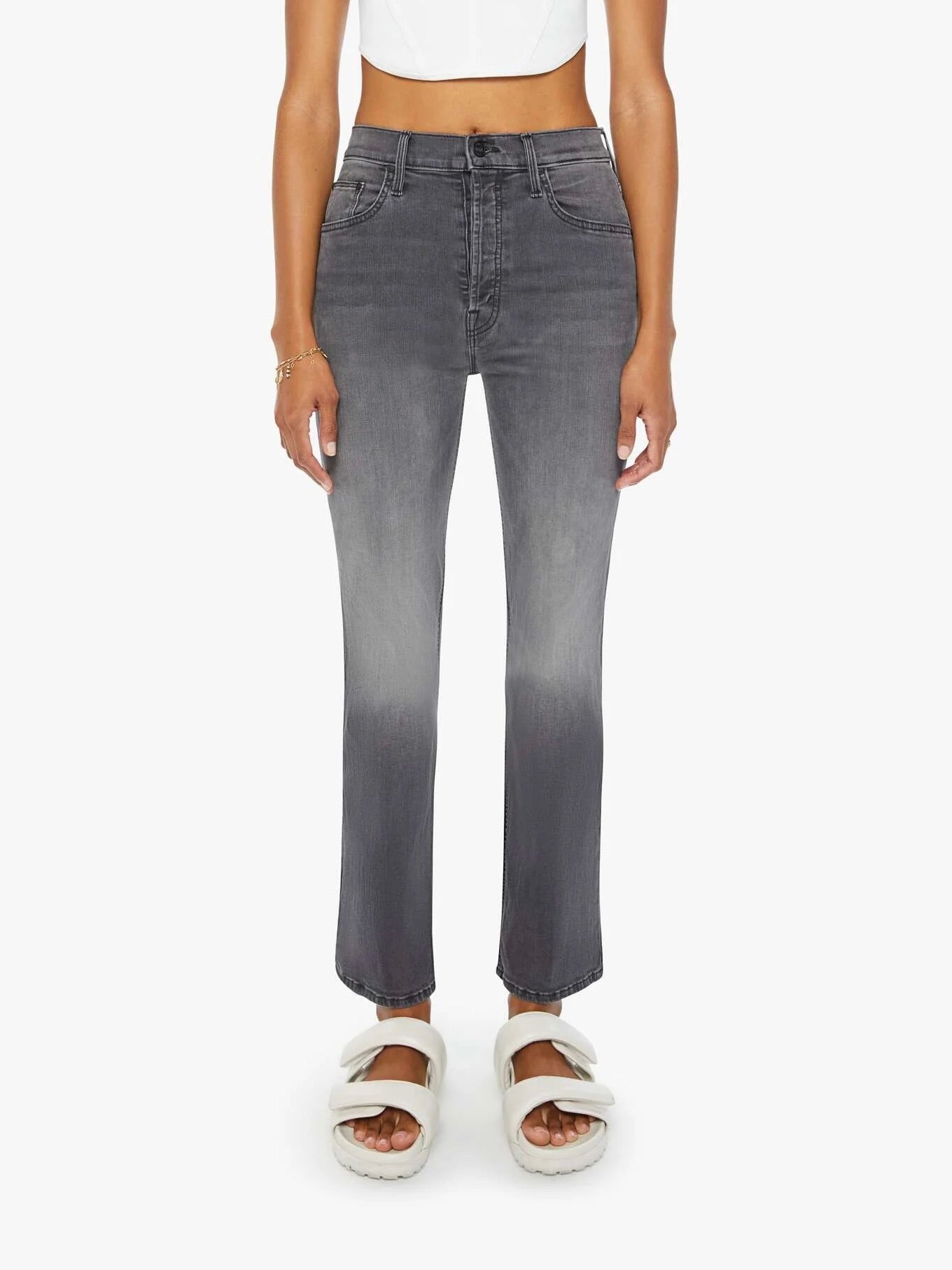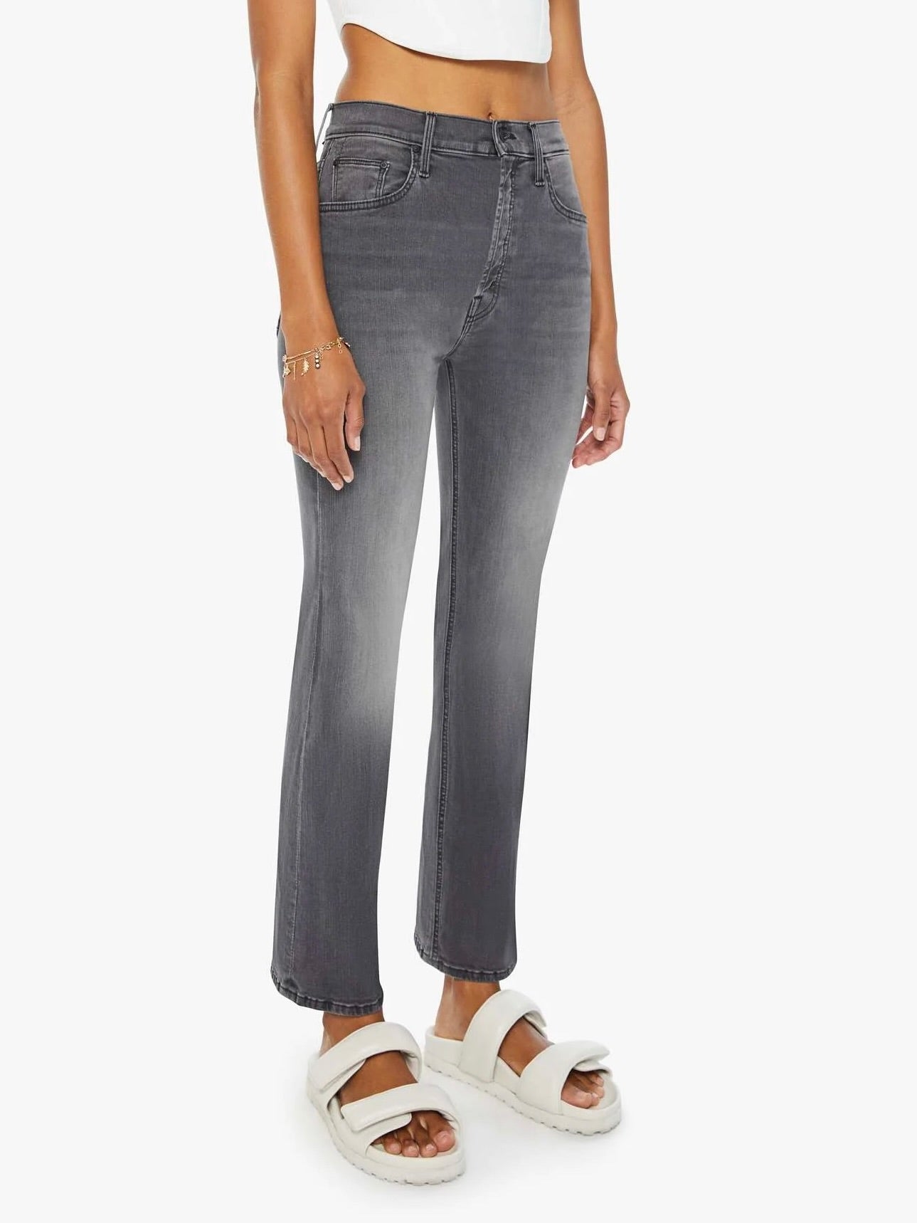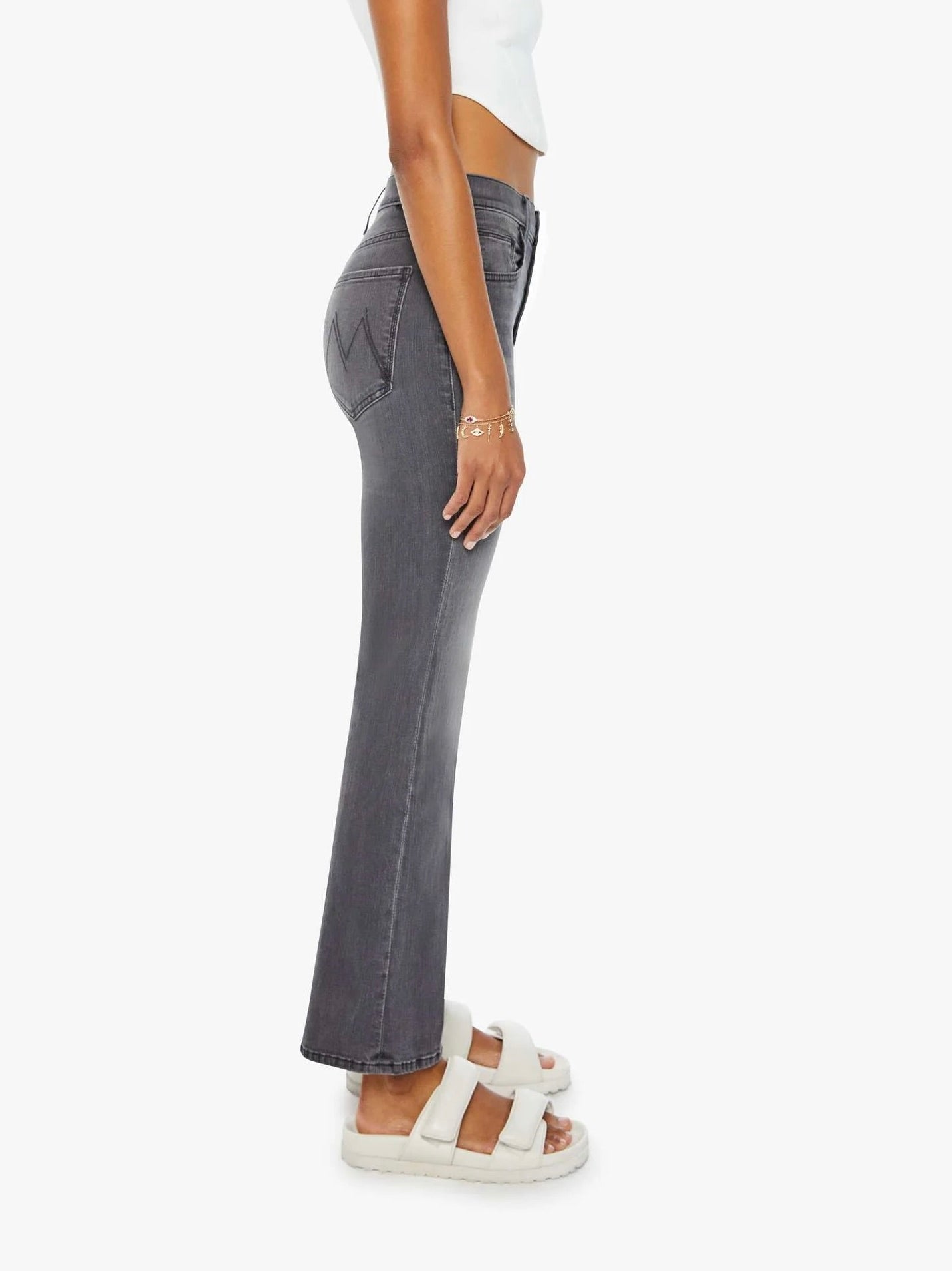 It’s lit. A high-rise flare with a button fly and a clean ankle-length hem. Cut from stretch denim. Lighting Up Lanterns is a dark grey wash with subtle whiskering and fading at the knees.