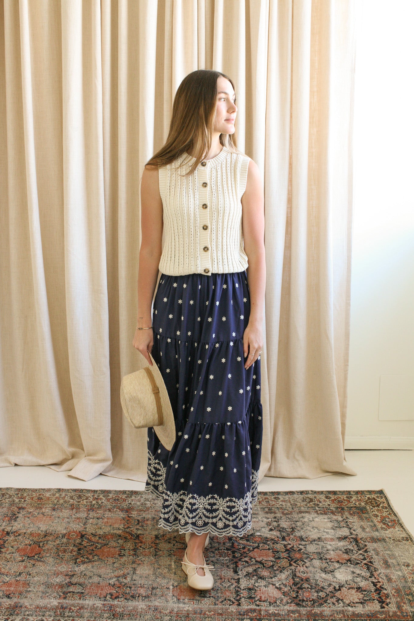 Navy Embroidered Midi Skirt