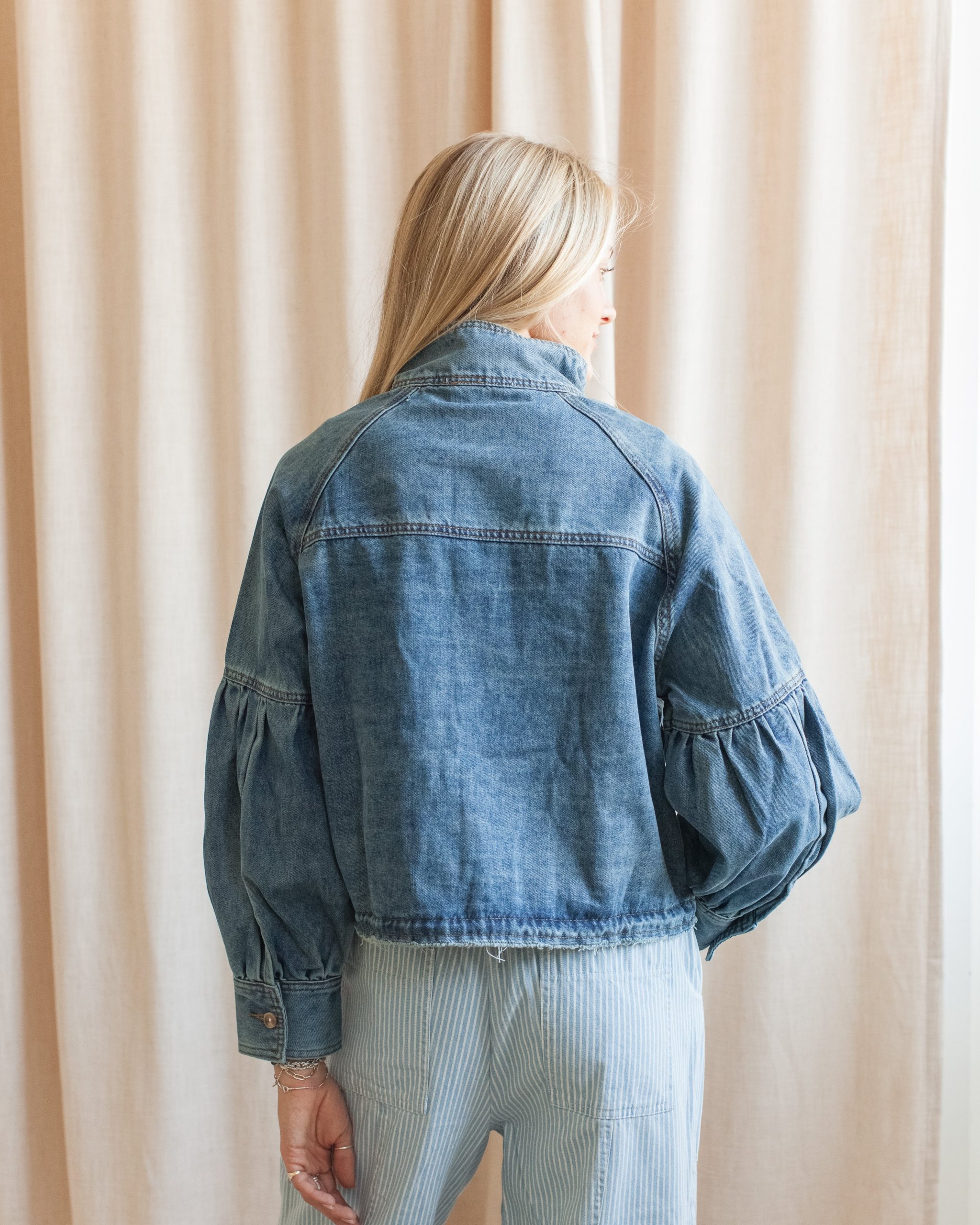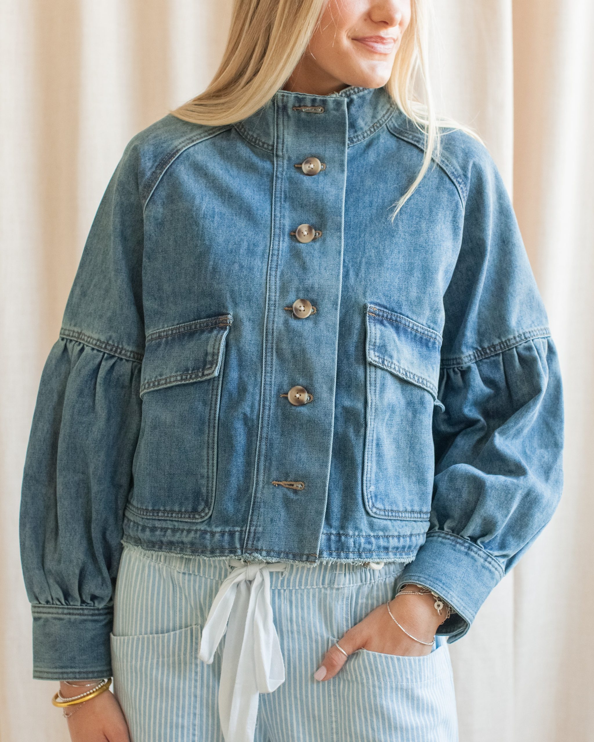 An oversized denim jacket with front buttons and large patch pockets. Jacket features balloon sleeves with pleating details on the arm and includes an adjustable interior cinch for a more fitted look.